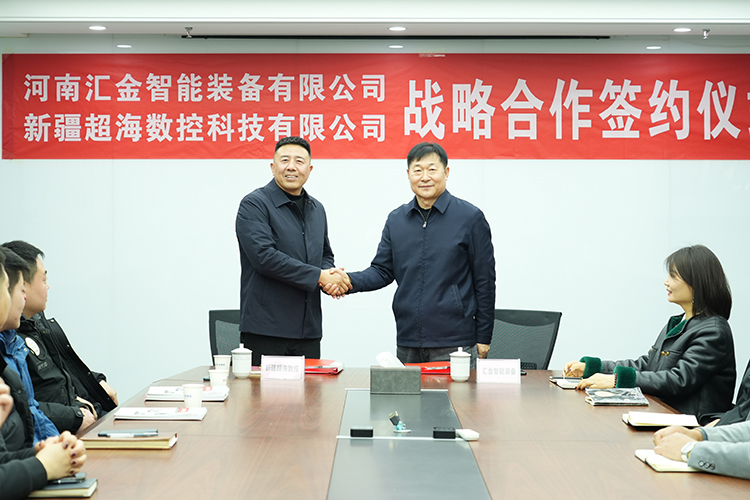 2025年2月10日上午,河南汇金智能装备有限公司与新疆超海数控科技有限公司战略合作签约仪式在汇金集团郑州总部大会议室成功举行。汇金集团董事长郭荣勋、ceo兼总裁孔攀红及集团各分公司项目负责人,新疆超海数控科技有限公司总经理牛梦雨、生产厂长刘志浩、李少波,武陟县工商联秘书长李中利等领导、嘉宾出席了仪式。